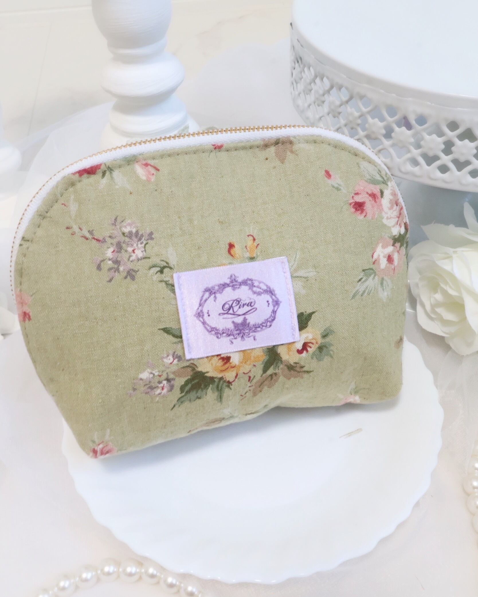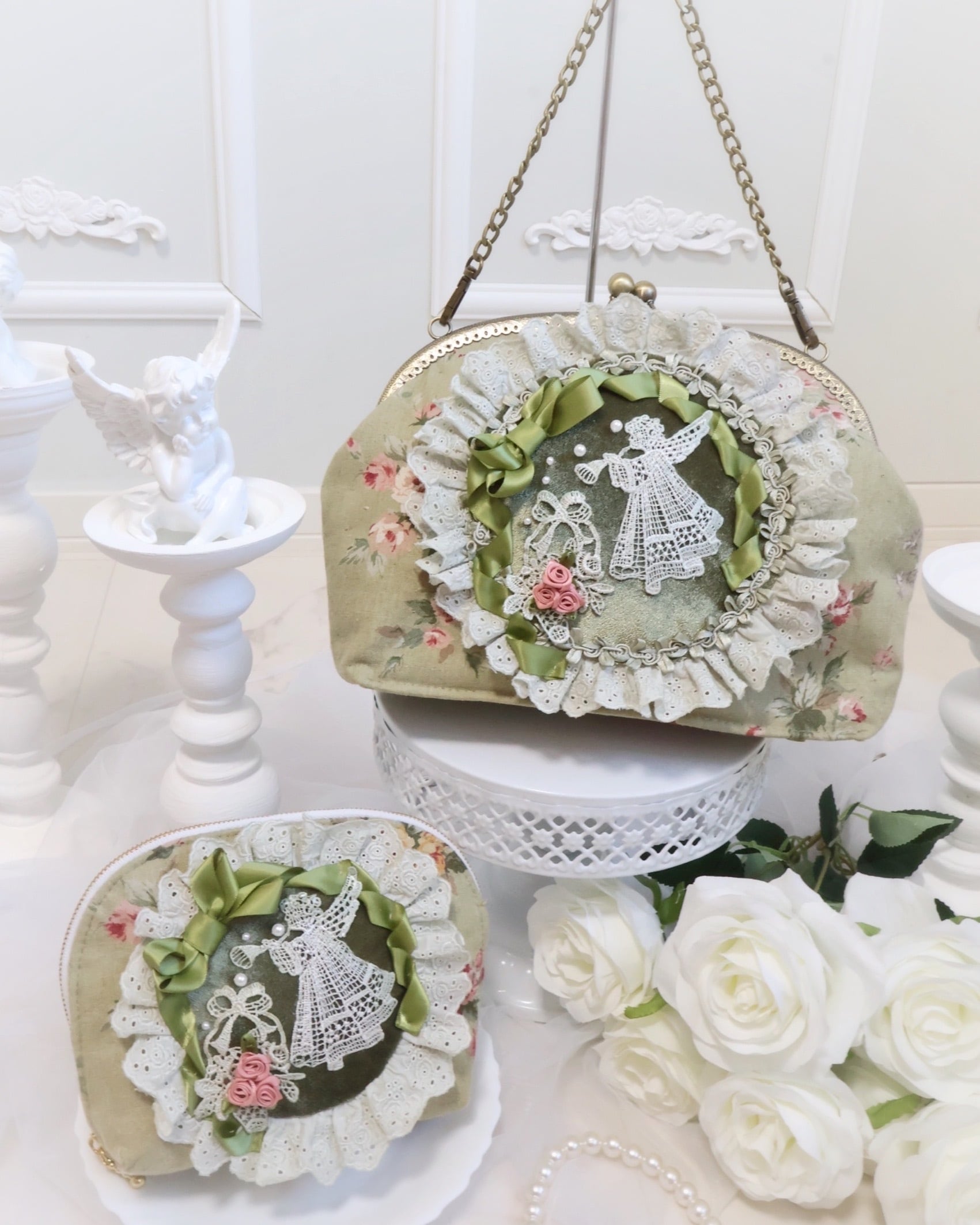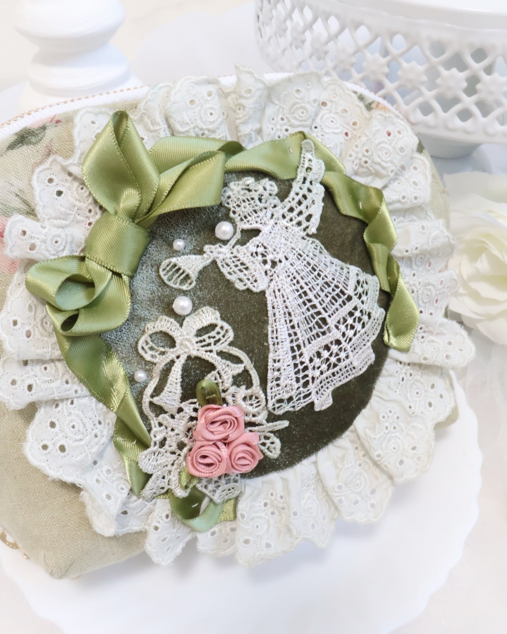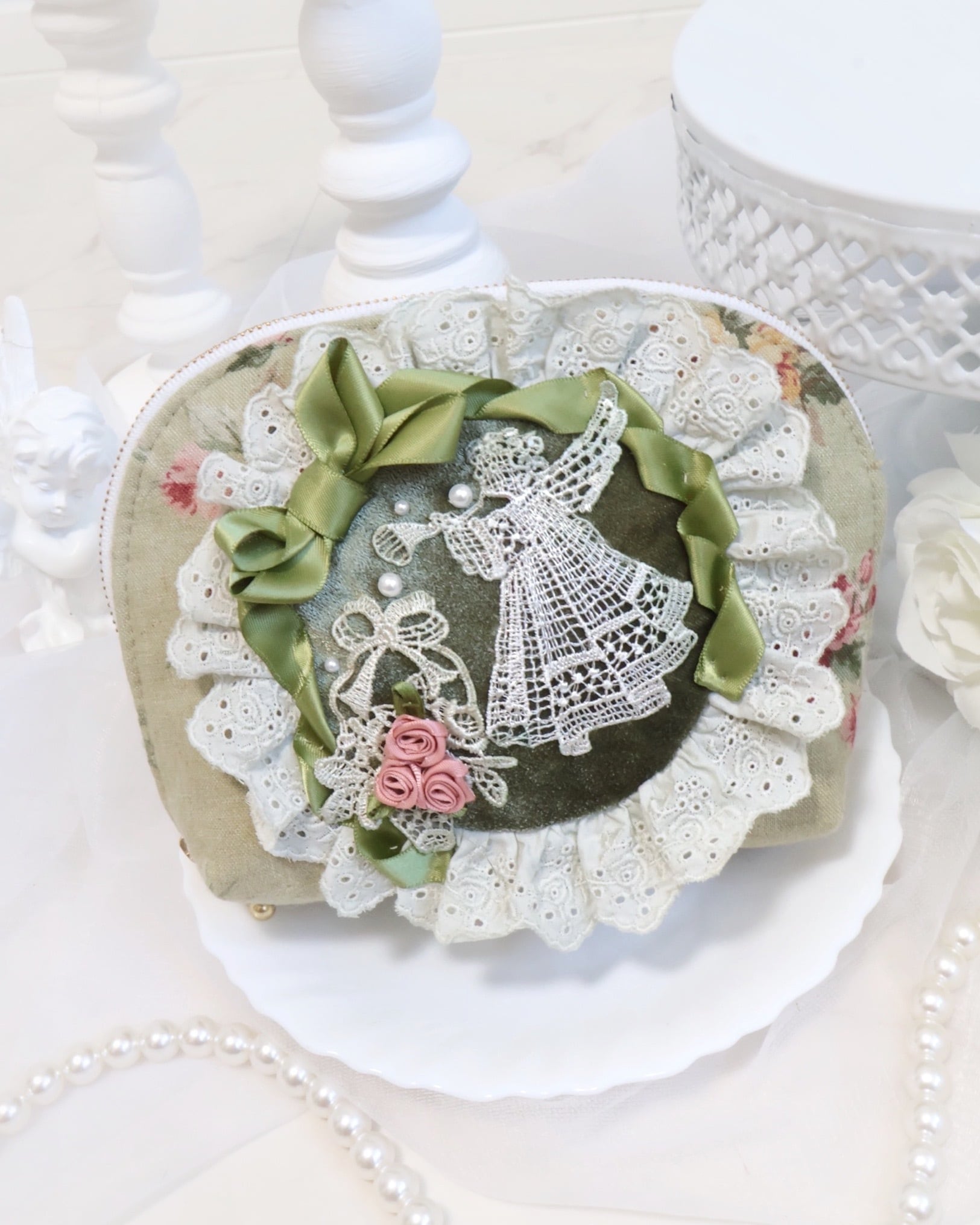 繊細なエンジェルレースが目を惹くファスナーポーチ。