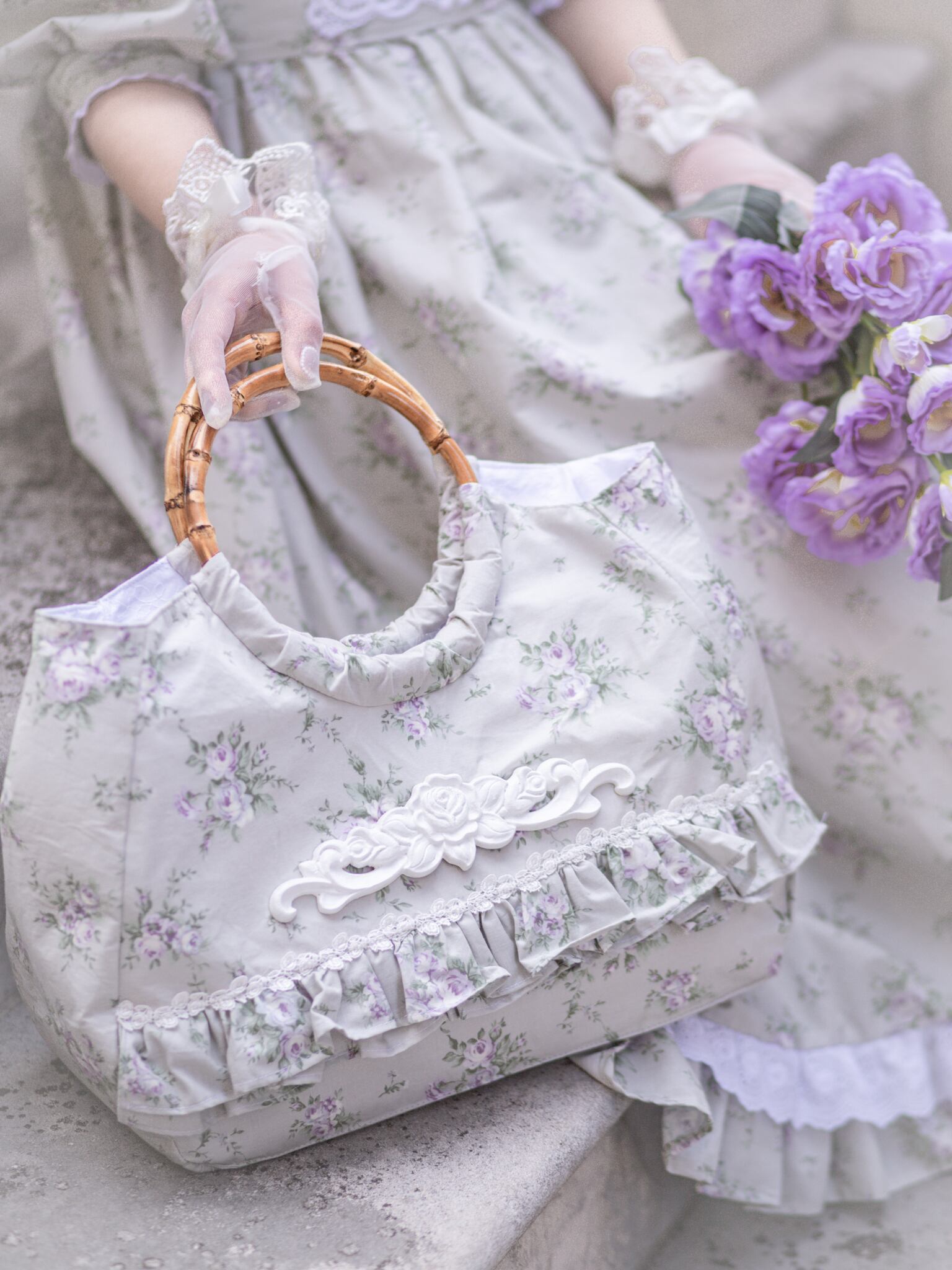 草原に淡い色合いの花々が咲き誇っているようなバンブーバッグ。