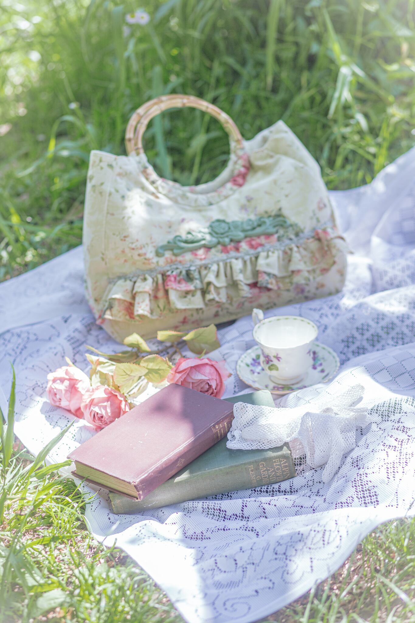 草原に淡い色合いの花々が咲き誇っているようなバンブーバッグ。